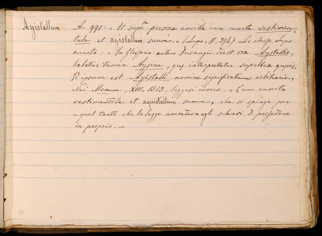 Nei Monum[enta], XIII, 1513,[1] leggesi invece: “Cum cuncta vestimentola et aquistallum suum”, che si spiega per quel tanto che la legge accordava agli schiavi di possedere in proprio.