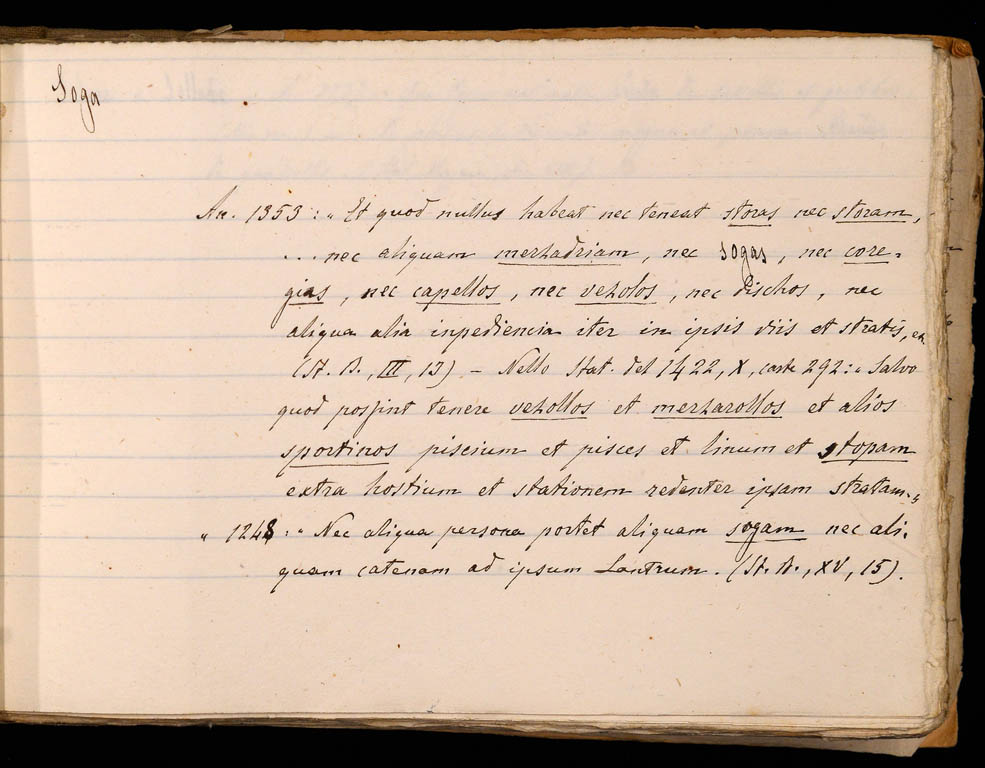 An[no] 1353: “Et quod nullus habeat nec teneat […] storas nec storam[1], (…) nec aliquam merzadriam, nec sogas, nec coregias, nec capellos, nec vezolos, nec dischos, nec aliqua alia inpediencia iter in ipsis viis et stratis, etc.”. (St[atuti di] B[ergamo], III, 13). Nello Stat[uto] del 1422, X, carta 292: “Salvo quod possint tenere vezollos et merzarollos et alios sportinos piscium et pisces et linum et stopam extra hostium et stationem redenter ipsam stratam”. [2]