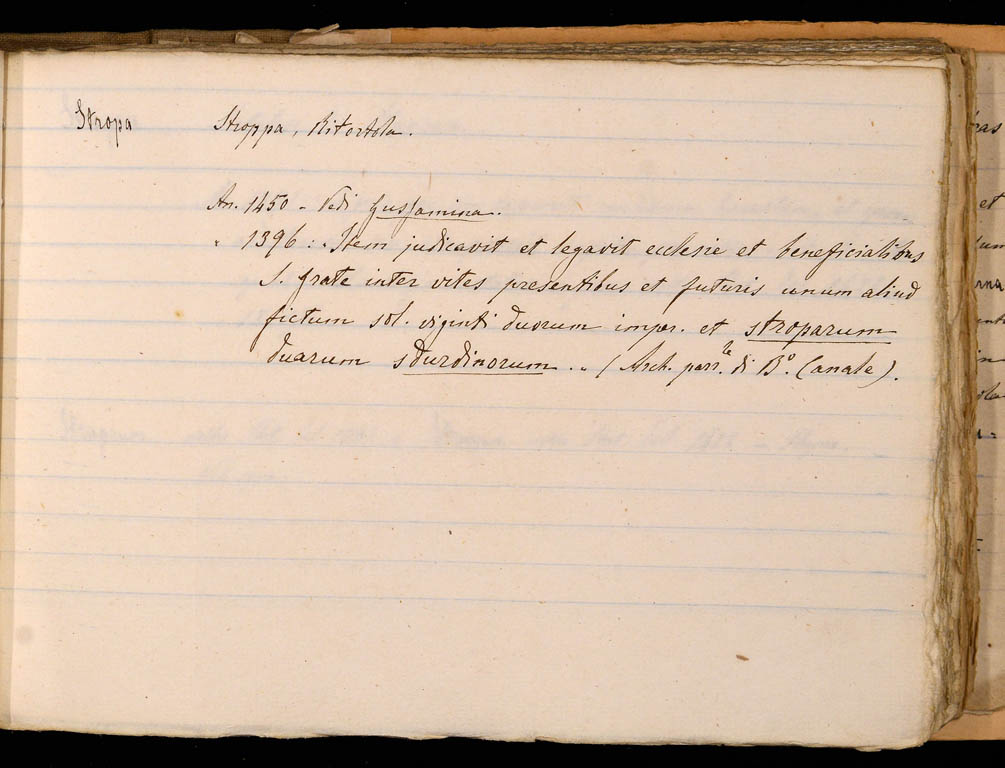An[no] 1396: “Item iudicavit et legavit ecclesie et beneficialibus S. Grate inter vites presentibus et futuris unum aliud fictum sol[dorum] viginti duorum imper[ialium] et stroparum duarum sdurdinorum”. (Arch[ivio] parr[occhia]le di B[orgo] Canale).[1]