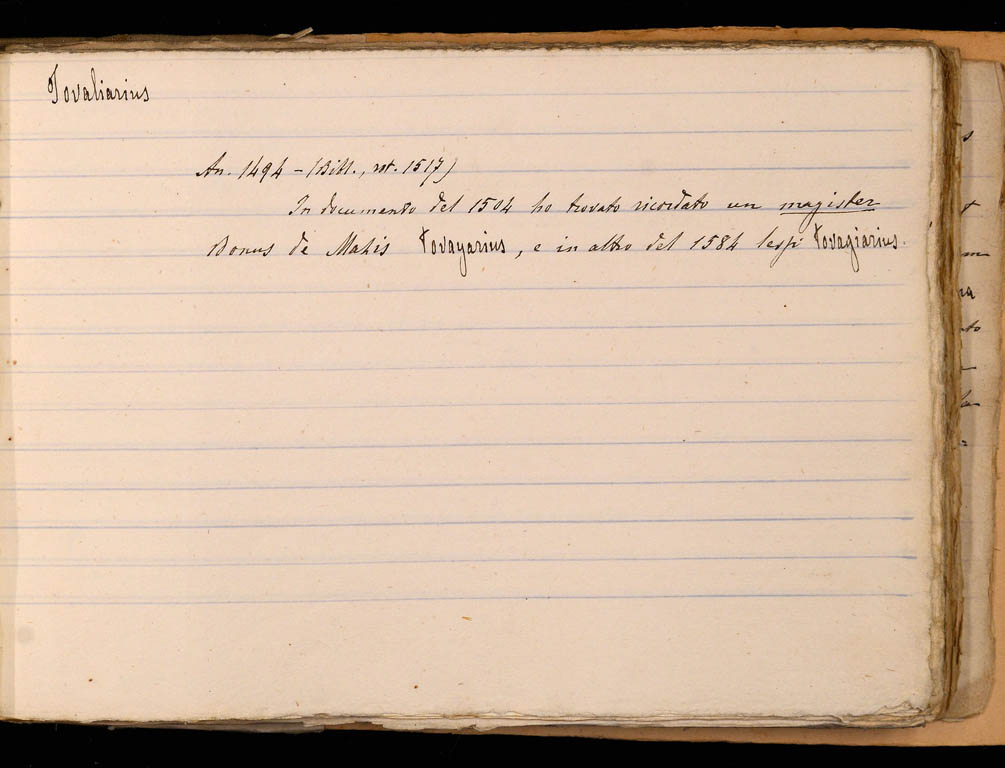 An[no] 1494. (Bibl[ioteca], rot[olo] 1517). [BCBg, perg. 1517/C][1] In documento del 1504 ho trovato ricordato un magister Donus de Mazis tovayarius, ed in altro del 1584 lessi tovagiarius.